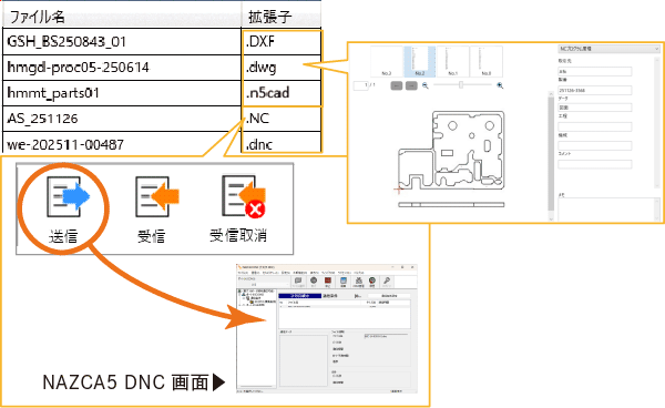 NAZCA5 DNC(別売)と連携し、登録されているNCプログラムを機械に送信したり、機械から受信したNCプログラムを上書き保存することもできます。